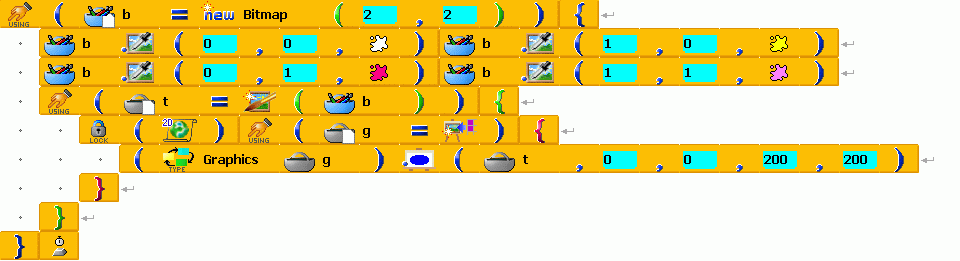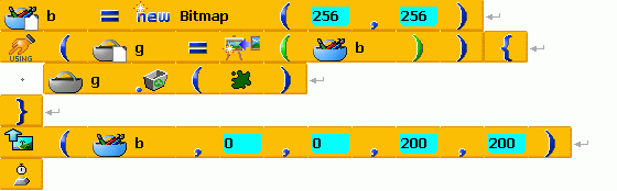 |  | | Vytvoř Graphics z bitmapy (For modes 2D, 3D, Console) |  Zobrazit příkladSkrýt příklad | | Vytvoří objekt Graphics z bitmapy. | | Vytvoří novou bitmapu velkou 256×256 pixelů, vytvoří z ní objekt Graphics a ten vyplní tmavě zelenou barvou. Nakonec vykreslí bitmapu na obrazovku. | | |