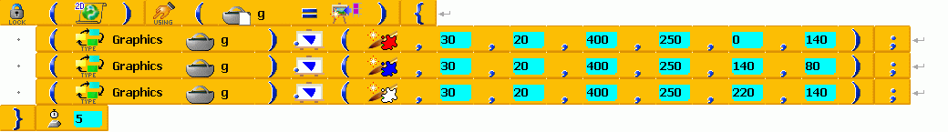 Do závorek za příkaz se vkládají tyto parametry: štětec, kterým se vykreslí vyplněná výseč, vymezení oblasti oblouku (vytvoří se pomocí bodových souřadnic levého horního rohu a výšky s šířkou), začáteční úhel a celková velikost vyplněné výseče v úhlech.