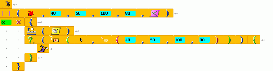 |  | | Je bod v oblasti? (For modes 2D, 3D, Console) |  Zobrazit příkladSkrýt příklad | | Vrátí true, pokud je zadaný bod v oblasti. | | Zviditelní Baltíka a vykreslí na obrazovku červený obdélník, který má levý horní roh na bodových souřadnicích 40, 50 (X, Y), jeho šířka je 100 a výška 80. Poté v nekonečném cyklu čeká na stisknutí tlačítka a pokud je kliknuto na červený obdélník, Baltík popojde. | | |