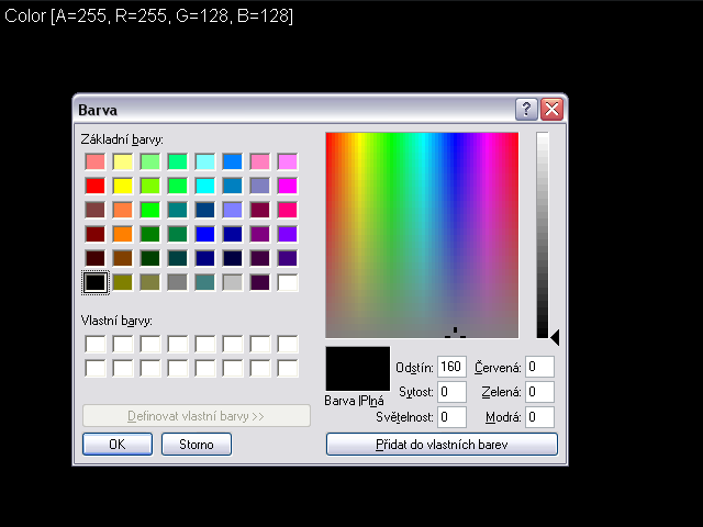 |  | | Výběr barvy uživatelem (For modes 2D, 3D, Console) |  Zobrazit příkladSkrýt příklad | | Otevře dialog pro výběr barvy ve spuštěném programu. | | Umožní nastavit barvu písma v ARGB kódu, zvolené hodnoty vypíše na obrazovku. | | |