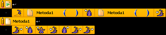 Potřebujete-li v programu vykonat činnost definovanou v metodě, musíte metodu zavolat. Toho dosáhnete tak, že otevřete okno Metody a v něm klepnete na ikonku s listem papíru vlevo od názvu metody, kterou chcete zavolat. Okno se pak zavře a vy umístíte příkaz k volání metody do požadované pozice. Kdykoliv pak program na tento příkaz narazí, provede posloupnost příkazů definovaných v těle dané metody.