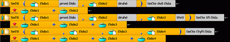 Na obrázku vidíte použití metod v praxi. První řádek programu zavolá metodu, která způsobí, že Baltík provede řadu pohybů. Potom se Baltík vznese a zase provede stejnou řadu pohybů. Na dalších řádcích je potom deklarace metody. Dole je zobrazen celkový počet metod.
