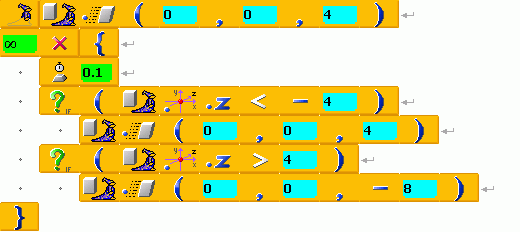 | Nastaví spritu Baltíka rychlost 0, 0, 4. Poté bude nekonečnokrát čekat 0,1 sekundy a kontrolovat Baltíkovu souřadnicic Z. Jestli je menší než -4, nastaví rychlost Baltíkovu spritu na 0, 0, 4, jestli je větší než 4, nastaví Baltíkovu rychlost na 0, 0, -8. | | |