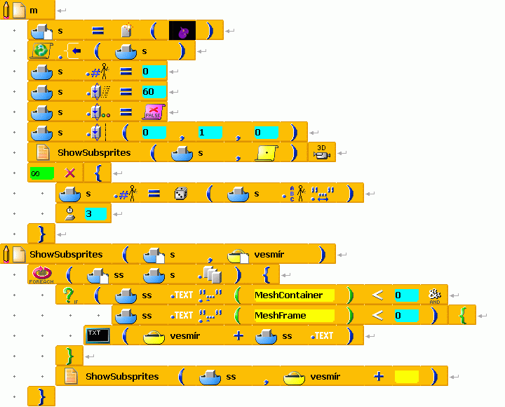 |  | | Najdi sprite podle jména (For modes 2D, 3D) |  Zobrazit příkladSkrýt příklad | | Vrátí sprite, jehož jméno je shodné se zadaným jménem. | | Vytvoří nový sprite z modelů 75 a 76, pojmenuje je Dwarf a Meteor a přidá je do 3D světa. Poté vyhledá sprite nazvaný Meteor a změní mu velikost. Pak vyhledá sprite Dwarf a změní mu pozici v 3D světě. | | |