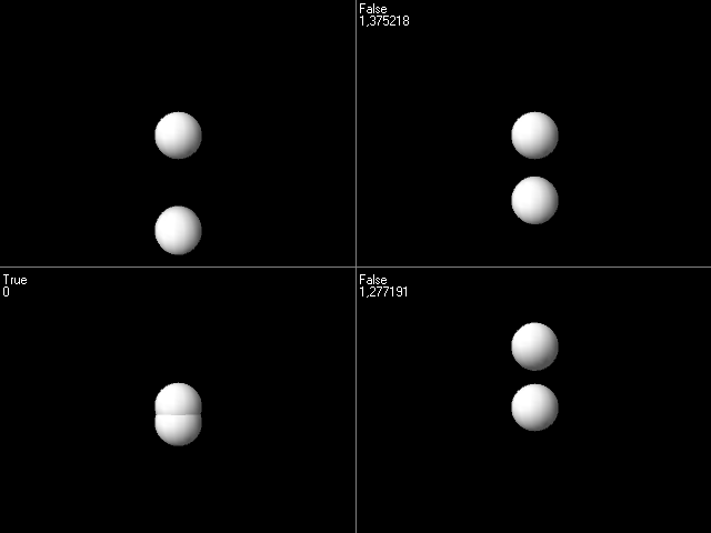 |  | | Koliduje s (For modes 2D, 3D) |  Zobrazit příkladSkrýt příklad | | Vypočítá případnou kolizi se zadaným spritem. | | Vytvoří 2 bílé koule o poloměru půl metru. První má střed na souřadnici [0,0,0] a druhá [0,2,0]. Počká na klávesu. První kouli je nastavena rychlost 10 centimetrů za vteřinu ve směru osy Y. Vytvoří se 2 objekty XText2D, pomocí nichž budou na obrazovku vypisovány informace o vzájemné poloze obou koulí. Spustí se nekonečný cyklus: Definuje proměnná d typu float. Pomocí prvního XTexy2D objektu je vypsáno, zda se koule protínají. V záporném případě je do proměnné d uložena vzdálenost středů obou koulí, v kladném případě 0. Tato hodnota je pak vypsána pomocí druhého XText2D objektu. Následuje čekání 0,09 vteřiny (záporné znamínko způsobí, že čekání nemůže být přerušeno stiskem klávesy). Všimněte si, že pokud potřebujeme, aby metoda vracela více návratových hodnot, můžeme použít parametr out (případně ref). | | |