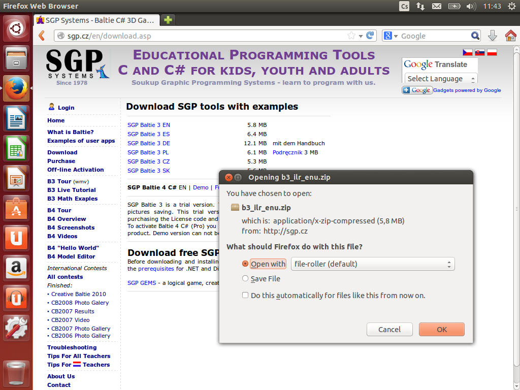 Start a web browser, go to a page with Baltie 3 downloads, select demanded localization and click on it. In the download dialog, select Open with default application, and confirm by clicking on OK button.